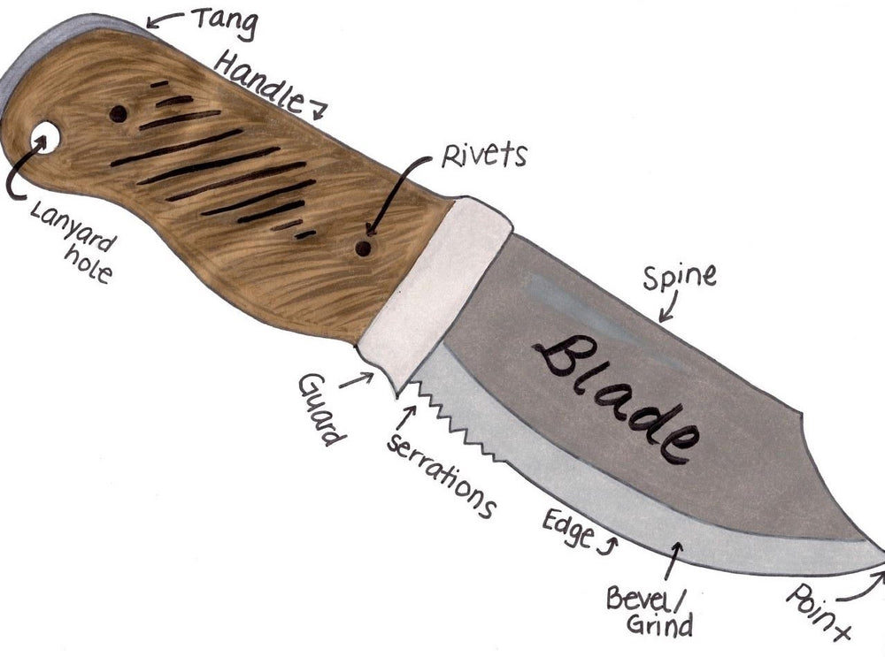 While there is a decent amount of variation in survival or bushcraft knives, these tools share basic anatomy. In order to properly discuss these knives, it is important to be familiar with certain terminology regarding bushcraft knife anatomy. Most of these terms are labeled in the diagram above.