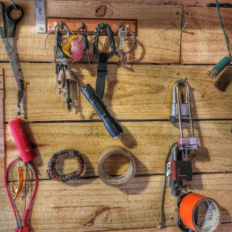 - Quick Access Items: Firestarter rod, ceramic blade, whistle, tinder wicks, ranger bands, P38 multi-tool, compass, jute tinder, Kevlar saw, illumination surface.