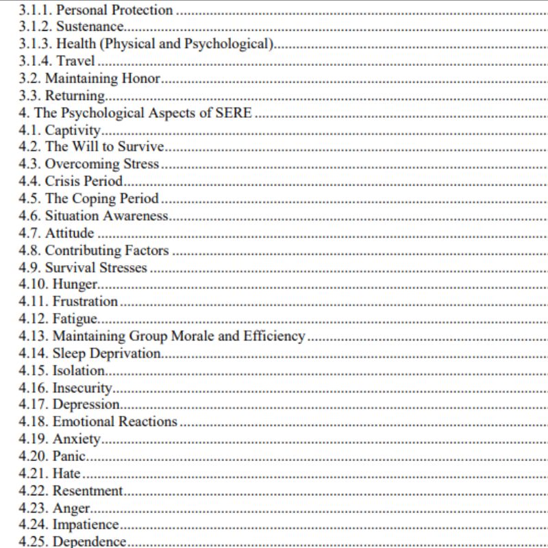 • Resistance & Recovery — Guidance on coping with captivity, executing escape plans, and coordinating with friendly forces for extraction.