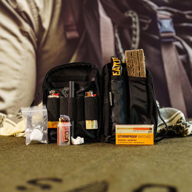 Don't stop with the basic Coyote Kit! Throw some juice on that base kit with one of our Survival Fire Kits [MOLLE compatible]. Complete with Black Beard Fire Stick, UST Fire Stix, UST Wetfire, two different types of Stormproof Matches, 2 BIC lighters, and a big 5"x1/2" Ferro Rod all packed away in a small tactical organizer with an American patch and internal lanyards.